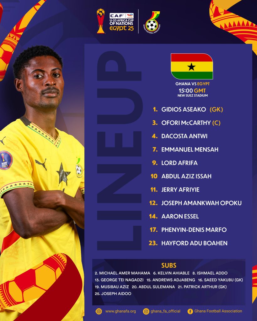 The stage is set in Suez as Ghana’s Black Satellites gear up for a make-or-break quarterfinal clash against host nation Egypt at the 2025 U-20 Africa Cup of Nations. With a coveted spot in the semifinals and qualification for the FIFA U-20 World Cup on the line, head coach Desmond Ofei has named a strong, refreshed starting lineup to face the challenge.