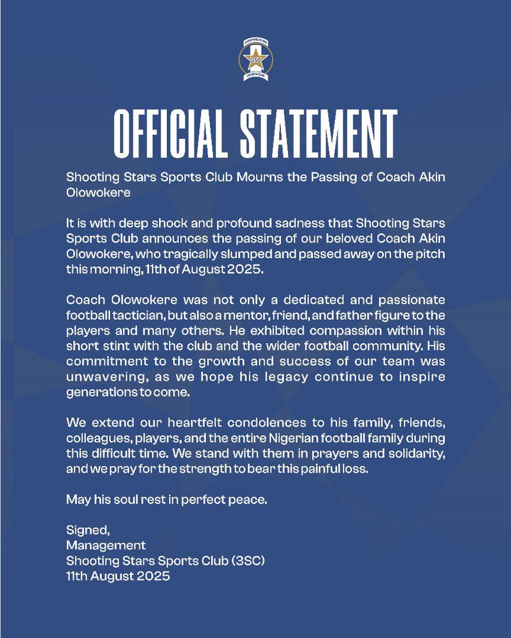 Olowokere, who was only recently appointed as Shooting Stars’ assistant coach on a contract running until 2027, was revered for his passion, dedication, and fatherly mentorship to players. In an emotional statement, the club confirmed his passing, describing him as not only a tactician but also a guide and inspiration to many in the game.
