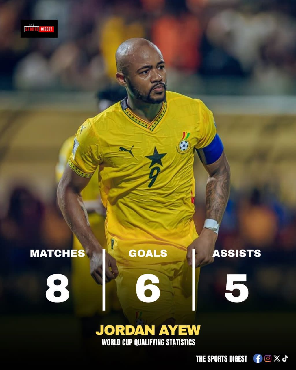 Jordan Ayew is rewriting the history books of the Black Stars with an astonishing display of form. The former Crystal Palace forward has recorded 6 goals and 5 assists in just 8 matches, a feat rarely seen in the national team’s history.