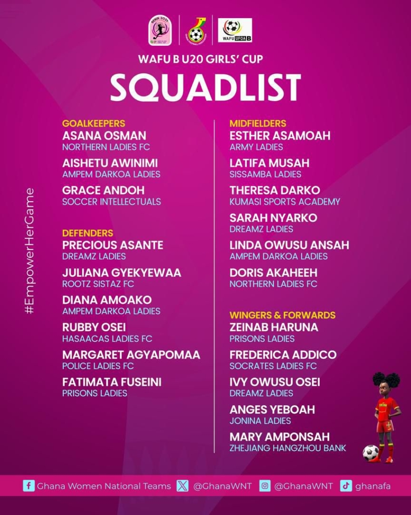 The stage is set, and the reigning queens are ready to defend their throne! Head coach Charles Sampson has unveiled a strong 20-member Black Princesses squad for the upcoming 2025 WAFU B U-20 Girls Cup, scheduled to take place in Benin from November 7 to 12, 2025.