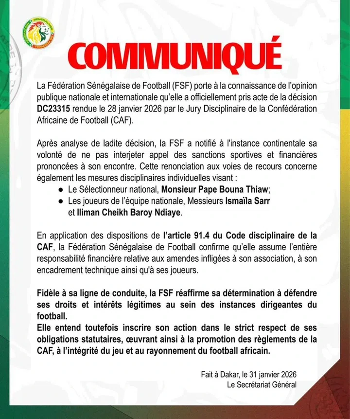 In a statement issued on January 31, 2026, the FSF confirmed it has accepted CAF’s disciplinary ruling in full and will not pursue an appeal. The federation said it would assume financial responsibility for all penalties under Article 91.4 of the CAF Disciplinary Code.