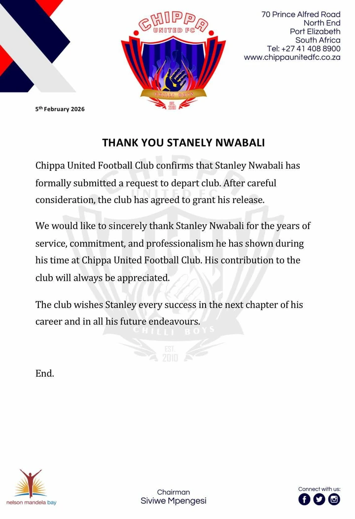 “We would like to sincerely thank Stanley Nwabali for the years of service, commitment, and professionalism he has shown during his time at Chippa United Football Club,” the club said. “His contribution will always be appreciated, and we wish him success in the next chapter of his career.”