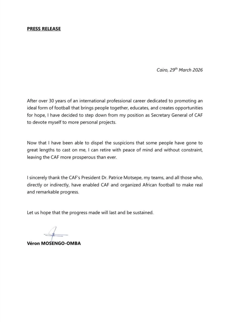 The Confederation of African Football has announced the resignation of its long-serving General Secretary, Véron Mosengo-Omba, bringing an end to a notable chapter in African football administration.